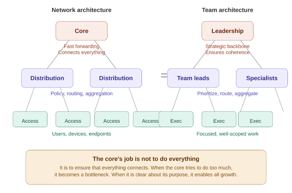 Think about the organizations you have been part of. How many of them were built using the organic growth model? Someone needed a thing done, so a person was hired. That person was good, so they took on more. Something adjacent came up and they absorbed it. No one ever asked: what is this team’s architecture? What is the access layer? What is the distribution layer? What is the core?