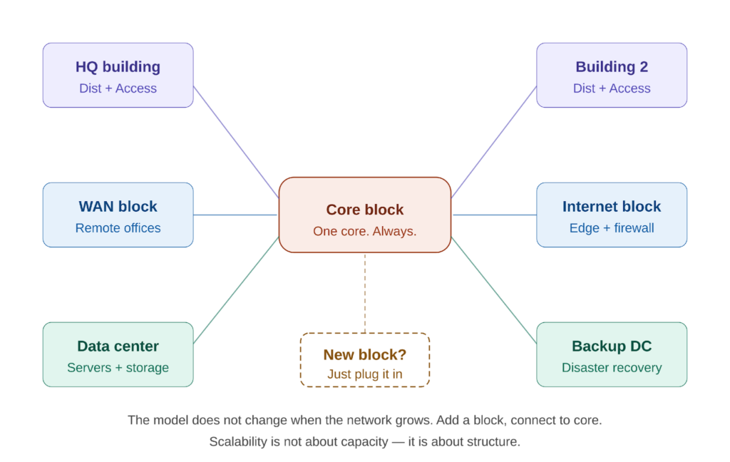The genius is that the model does not change when the network grows. You do not redesign the architecture when you add a new site. You do not restructure the core when you bring a new data center online. You add a block, connect it to the core, and the system absorbs it.
