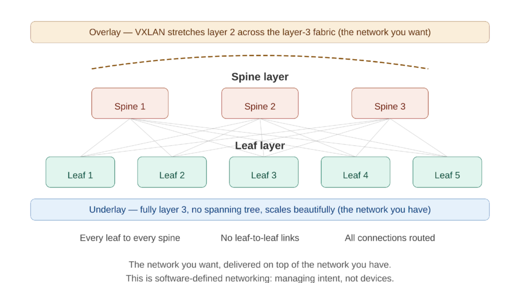 That is your underlay — the network you have. Fully layer three, scales beautifully. But your applications still need layer two. So you build an overlay using VXLAN that stretches layer-two connectivity across the layer-three underlay. The hosts at either end think they are on the same network segment. Underneath, packets are routed across a highly scalable fabric.