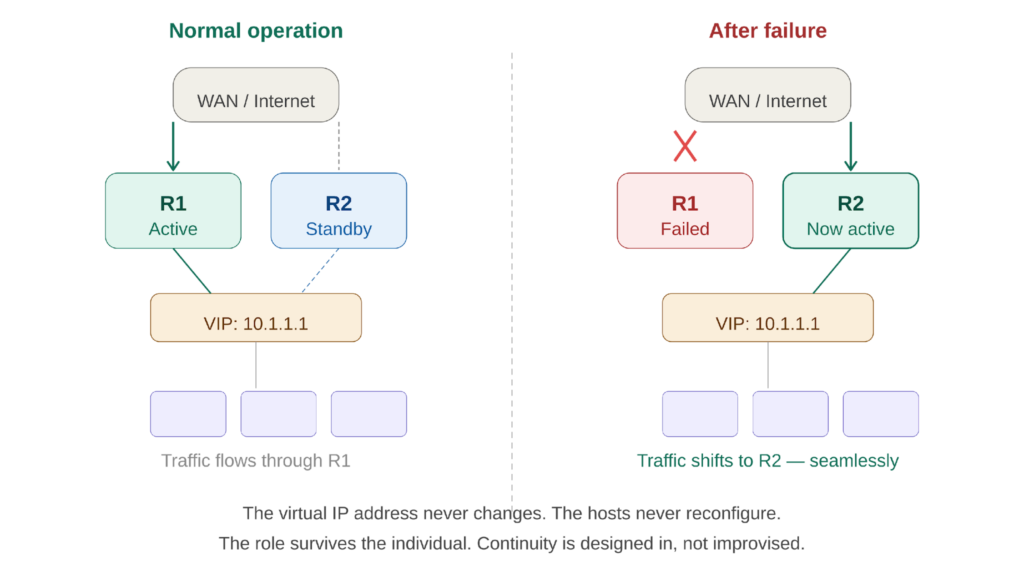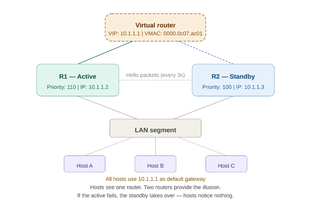 The best redundancy is invisible. The hosts never know the failover happened. That is not a limitation of the protocol — it is the entire point.