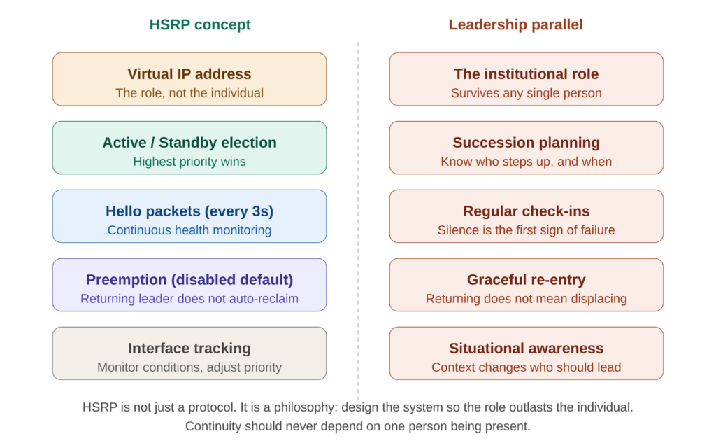 The parallels between HSRP and organizational leadership are not metaphorical — they are structural. Both deal with the same fundamental problem: how do you ensure that a critical function continues when the person performing it is no longer available?