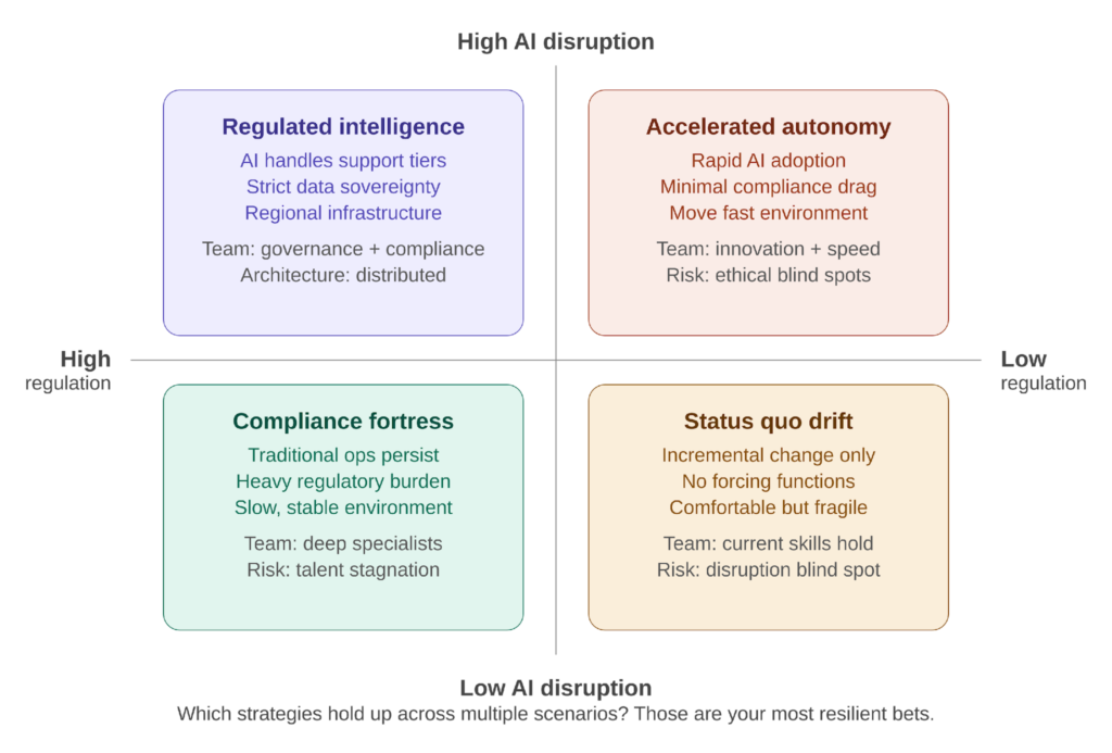 Figure 3: A scenario matrix built from two key uncertainties — AI disruption and regulatory pressure.