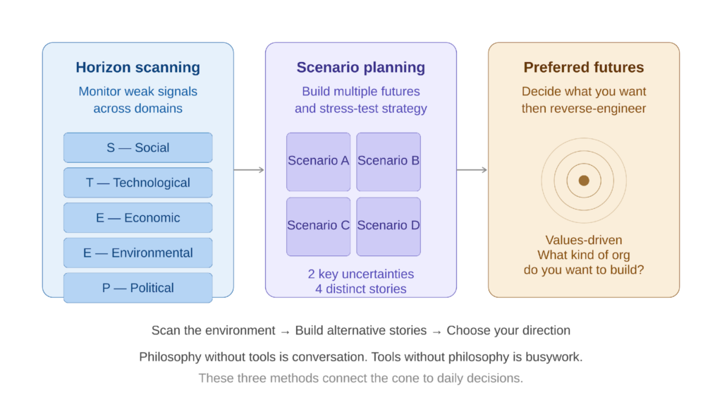 Philosophy without tools is conversation at a dinner party. The futures studies field offers concrete methods that technology leaders can start using immediately.