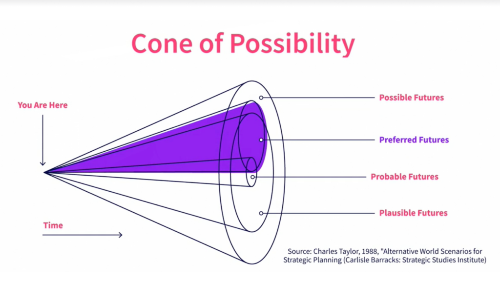 Using the cone invites us to explore a range of plausible and probable futures, and then clarify which preferred futures we want to intentionally shape.
